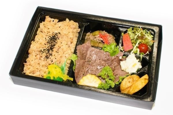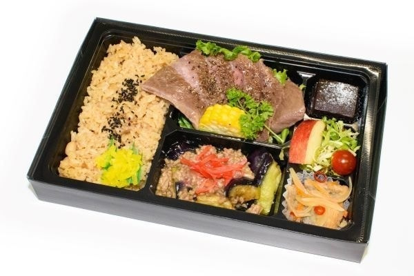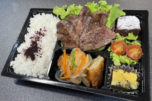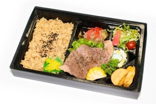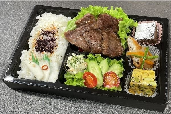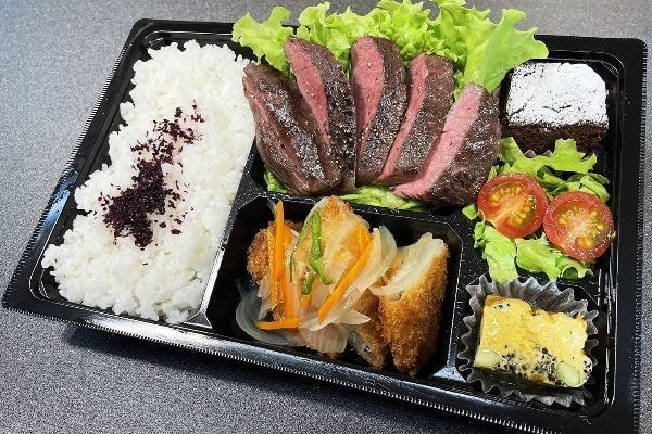 日本一に輝いた長崎和牛A5のトロケルステーキと特性の餡かけ白身フライを主菜に使い、季節の食材を使った副菜を盛りつけた弁当です。